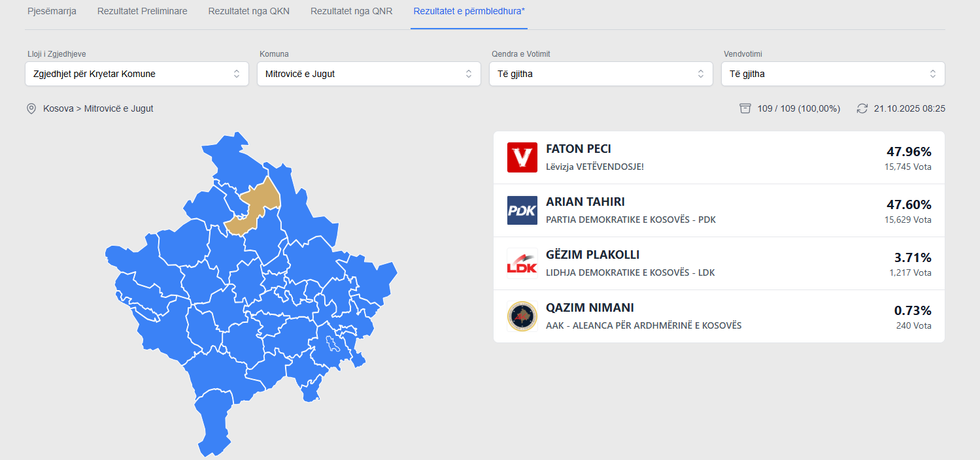 Sipas të dhënave zyrtare nga Komisioni Qendror i Zgjedhjeve (KQZ), kandidati i Lëvizjes Vetëvendosje (LVV), Faton Peci, ka siguruar 47.96 për qind të votave, ndërsa kandidati i Partisë Demokratike të Kosovës (PDK), Arian Tahiri, ka marrë 47.60 për qind.