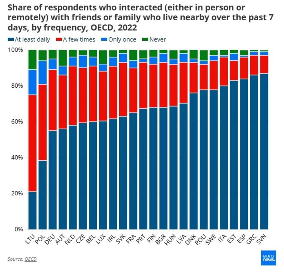 Në të kundërt, Lituania ka pjesën më të lartë të të anketuarve që nuk kanë bashkëvepruar (as personalisht as nga distanca) me miqtë ose familjen që jetojnë afër gjatë shtatë ditëve të fundit.