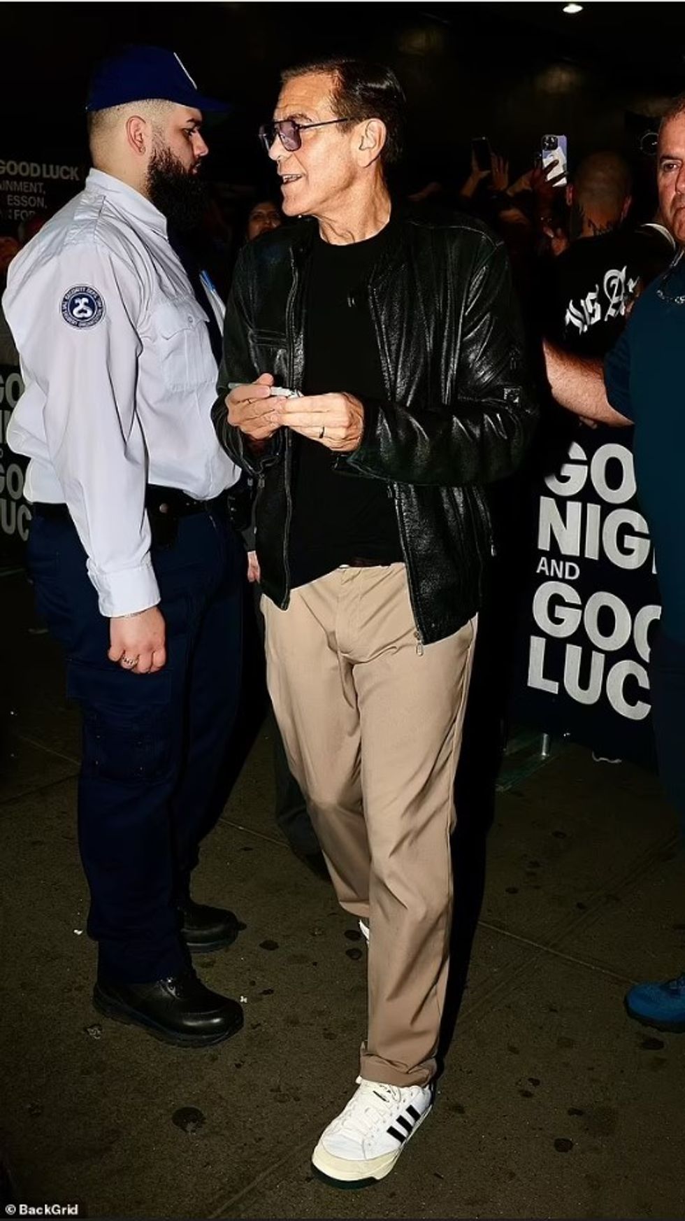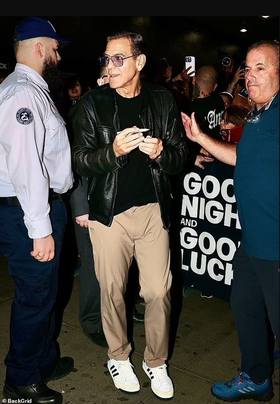 64-vjeçari, i cili luan në versionin teatror të “Good Night, and Good Luck”, u takua me fansat jashtë Teatrit Winter Garden, i veshur me stil në të zeza dhe syze të lehta.