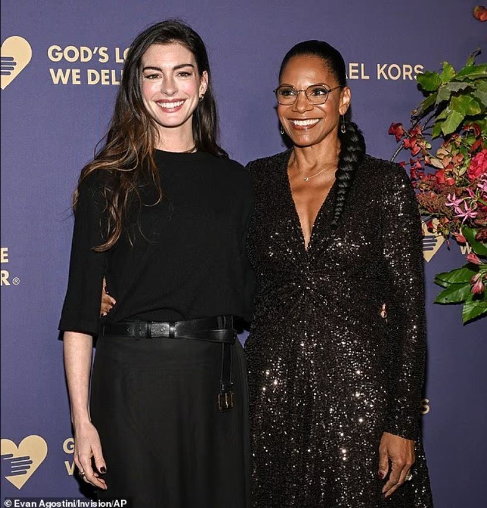 Anne Hathaway, 42 vjeçe, zgjodhi një pamje të zezë klasike me bluzë të gjerë dhe fund të gjatë, duke shtuar shkëlqim me byzylykë argjendi, shkruan DailyMail.