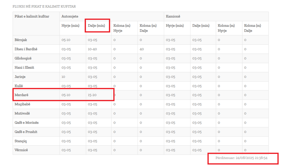 Po ashtu, në Merdarë janë regjistruar pritje më të gjata në dalje, që variojnë nga 15 deri në 20 minuta.
