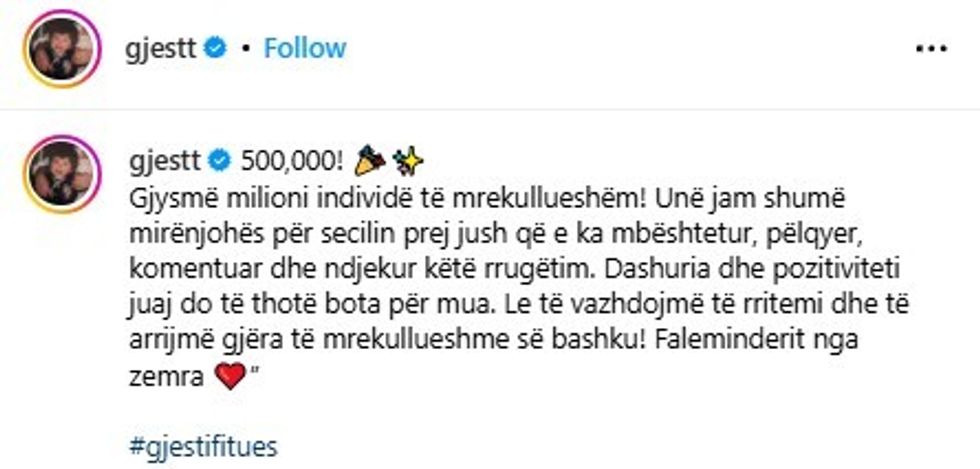Gjesti arrin 500 mijë ndjekës në Instagram: Mirënjohës për çdo mbështetje