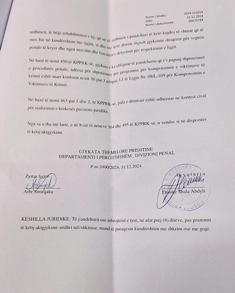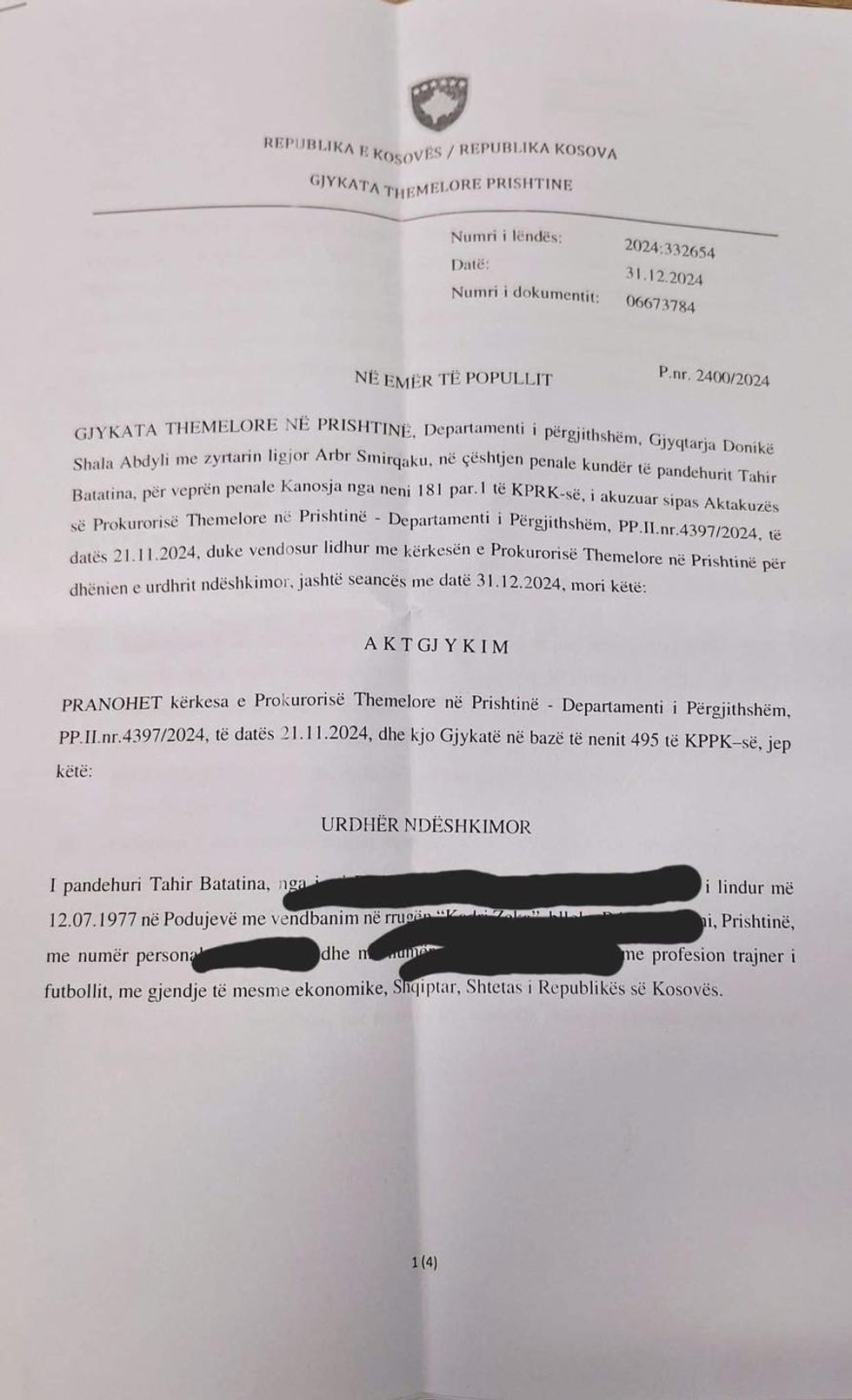 Pasi kam bërë denoncim për kanosje si gjyqtar kryesor në ndeshjen e Albi Mall Superligës në Futboll, e zhvilluar më 31.08.2024 në stadiumin “Fadil Vokrri” ndërmjet FC Prishtina dhe KF Llapi, sot më 21.01.2025 kam pranuar nga Gjykata Themelore në Prishtinë aktgjykimin si palë e dëmtuar.