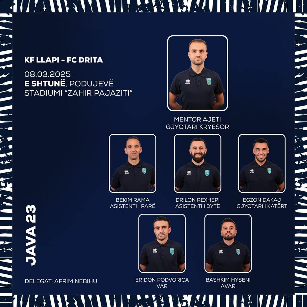 E në duelin mes Llapit dhe Dritës, gjyqtar kryesor do të jetë Mentor Ajeti me ndihmësit Bekim Rama dhe Drilon Rexhepi.
