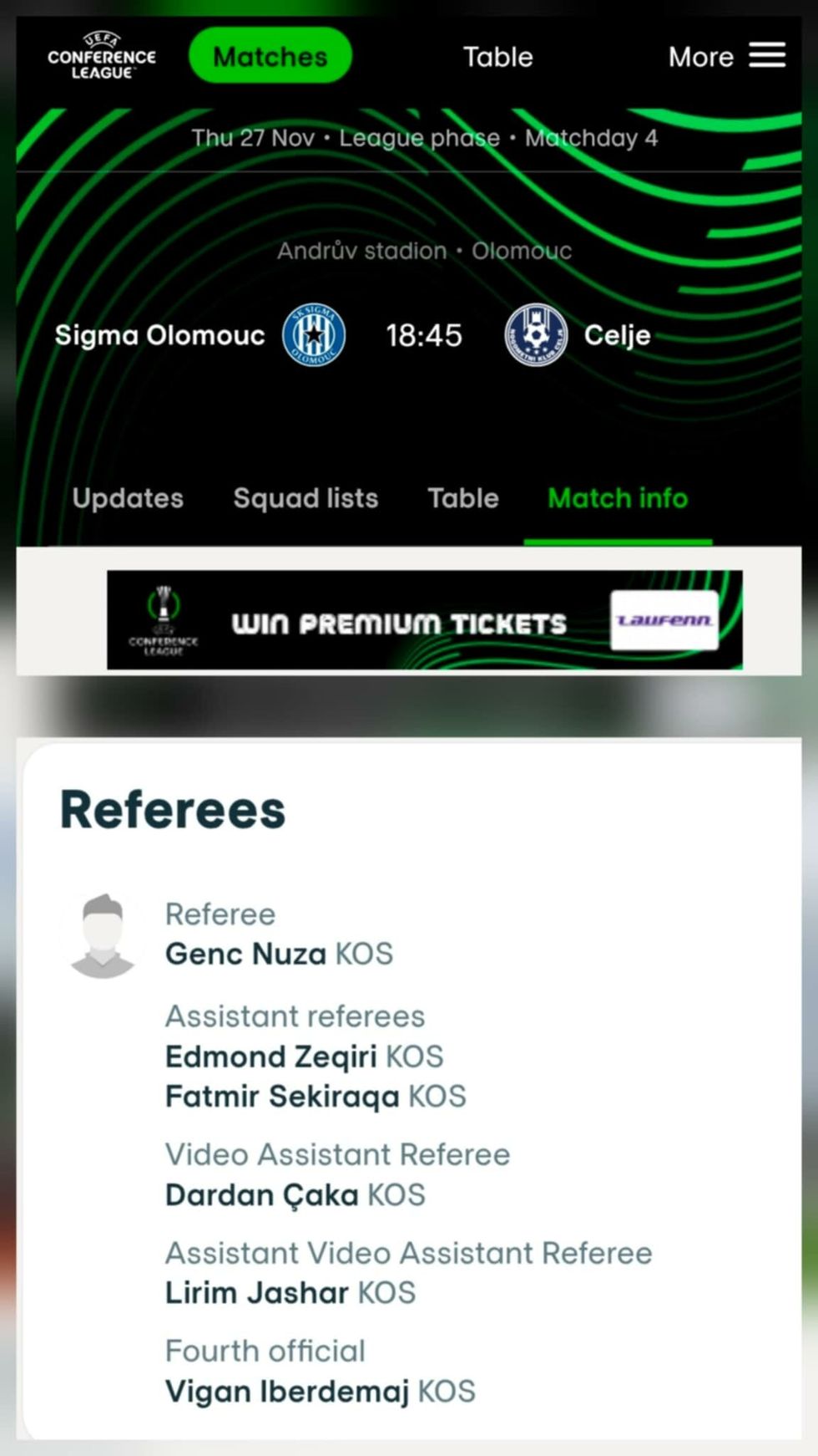 Gjashtë gjyqtarë nga Kosova janë caktuar nga UEFA për të ndarë drejtësinë në ndeshjen e Ligës së Konferencës mes Sigma Olomouc-NK Celje.