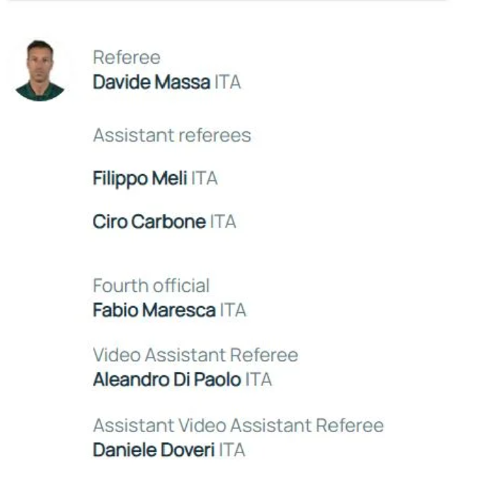 Asistentët e tij në këtë përballje të rëndësishme do të jenë Filippo Meli dhe Ciro Carbone, ndërsa gjyqtar i katërt do të jetë Fabio Maresca.
