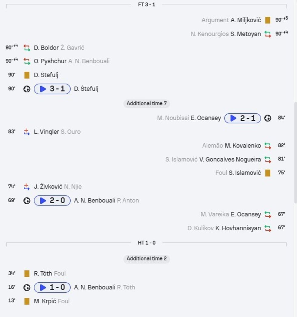 Me sa duket, Bejtullahu ka zëvendësuar lojtarë. Sipas rezultateve në faqen zyrtare të UEFA-s, Dejan Boldor mori kartonin e dytë në minutat shtesë.