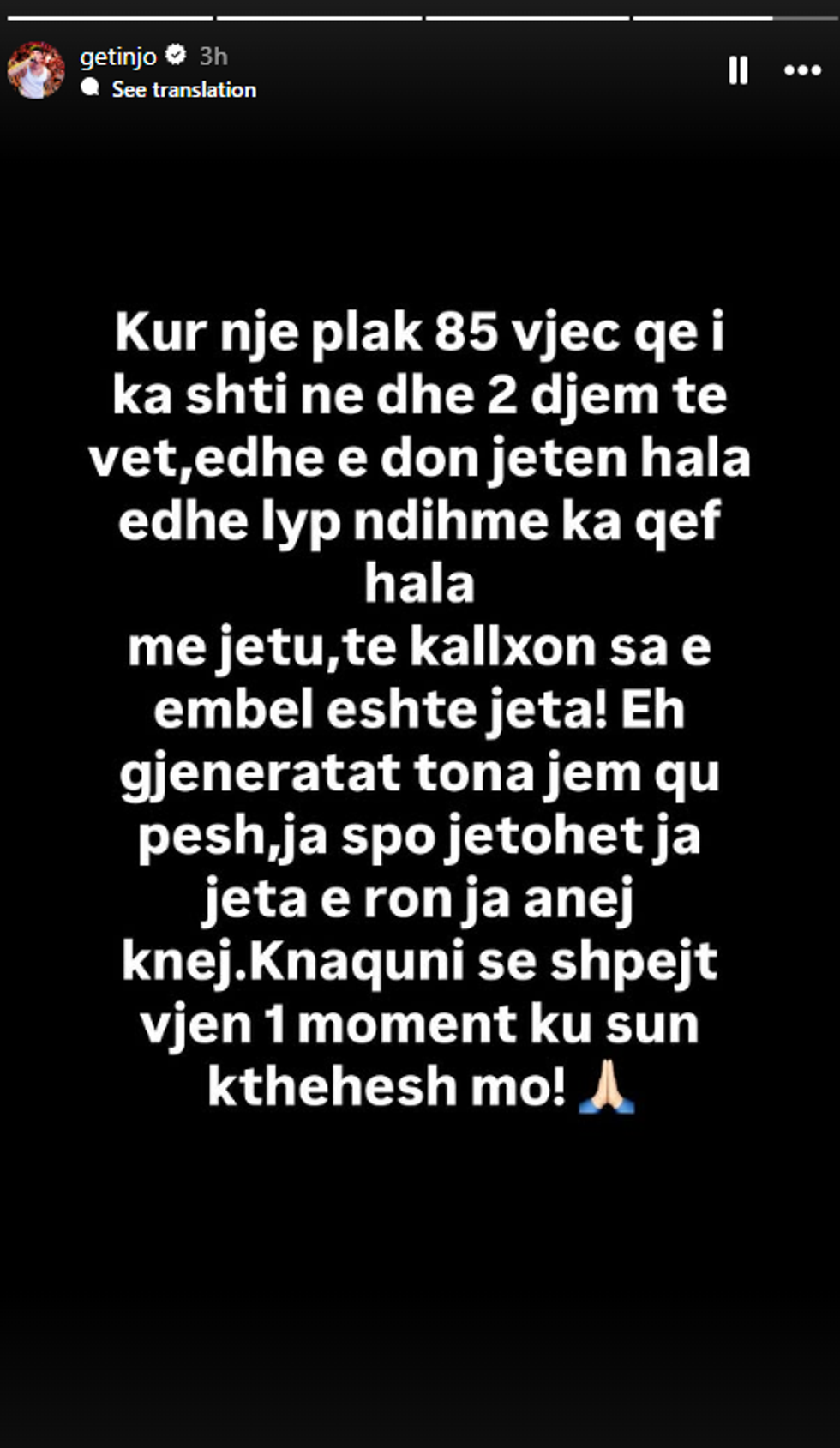 “Kur një plak 85 vjeç që i ka shti në dhe dy djemtë e vet ende e don jetën, ende lyp ndihmë, ka qejf hala me jetu, të kallxon sa e ëmbël është jeta", shkruan reperi.