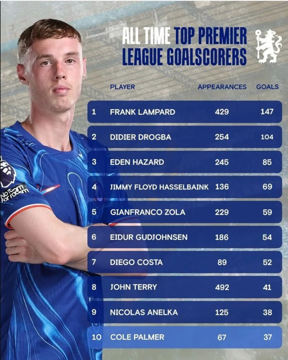 Palmer në fakt ka barazuar numrin e golave të Willian, i cili gjithashtu shënoi 37 gola në Ligën Premier, megjithatë, braziliani e arriti këtë rezultat në 234 ndeshje për Chelsean.