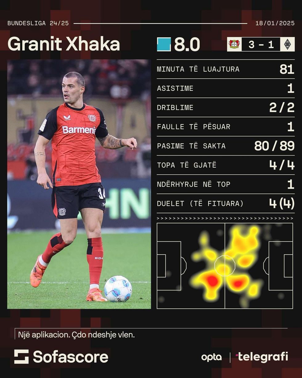 Për paraqitjen e tij fantastike dhe asistimin, Xhaka u vlerësua me notën 8.0 nga Sofascore, që ishte më e larta në këtë ndeshje pas Florian Wirtz (9.5).