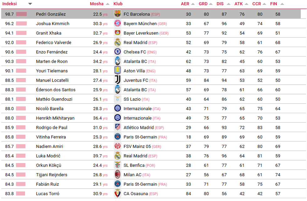 Kjo renditje e CIES u ndërtuar në bashkëpunim me Impect, që llogarit disa të dhënë për lojtarët.