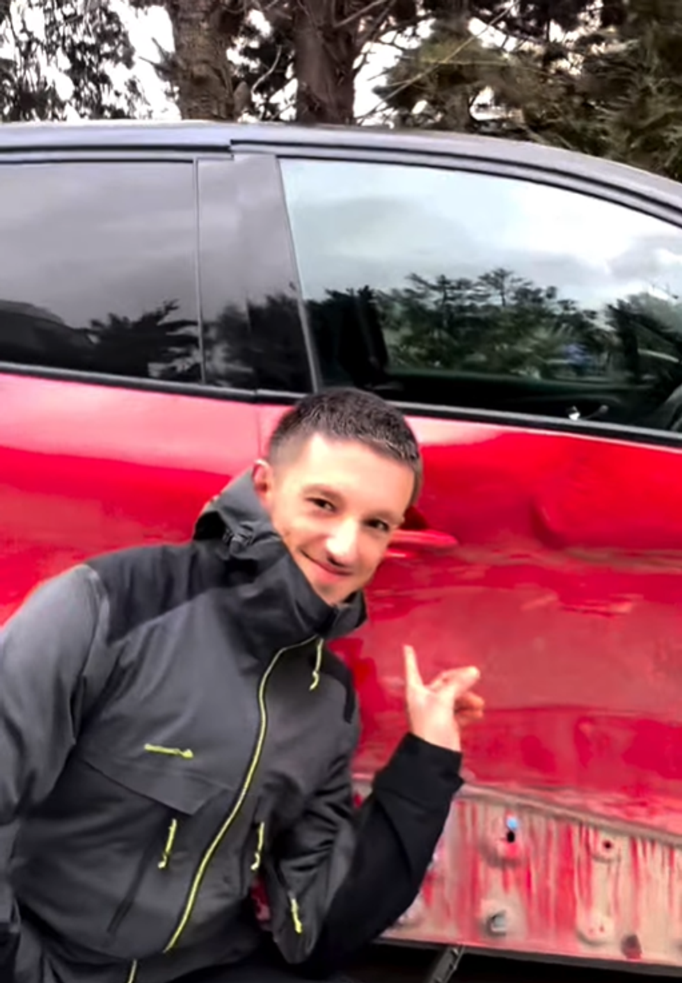 Në një moment tjetër, Vullneti shfaqet duke treguar makinën e dëmtuar, duke e bërë situatën edhe më komike.