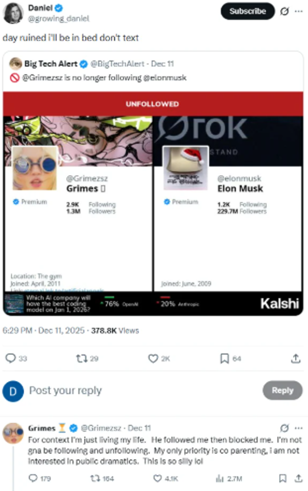 Grimes deklaroi më parë se nuk e ndiqte më Muskun në këtë platformë dhe më vonë zbuloi se ai në fakt e kishte bllokuar.
