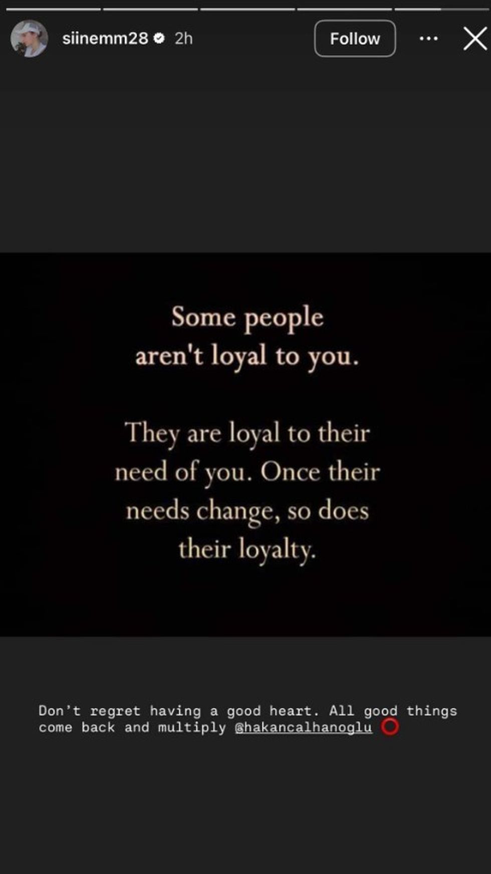 “Sapo nevojat e tyre ndryshojnë, ndryshon edhe besnikëria e tyre. Mos ndjej keqardhje që ke zemër të mirë, Hakan. Gjithçka e mirë kthehet dhe shumëfishohet”, ka thënë ajo.