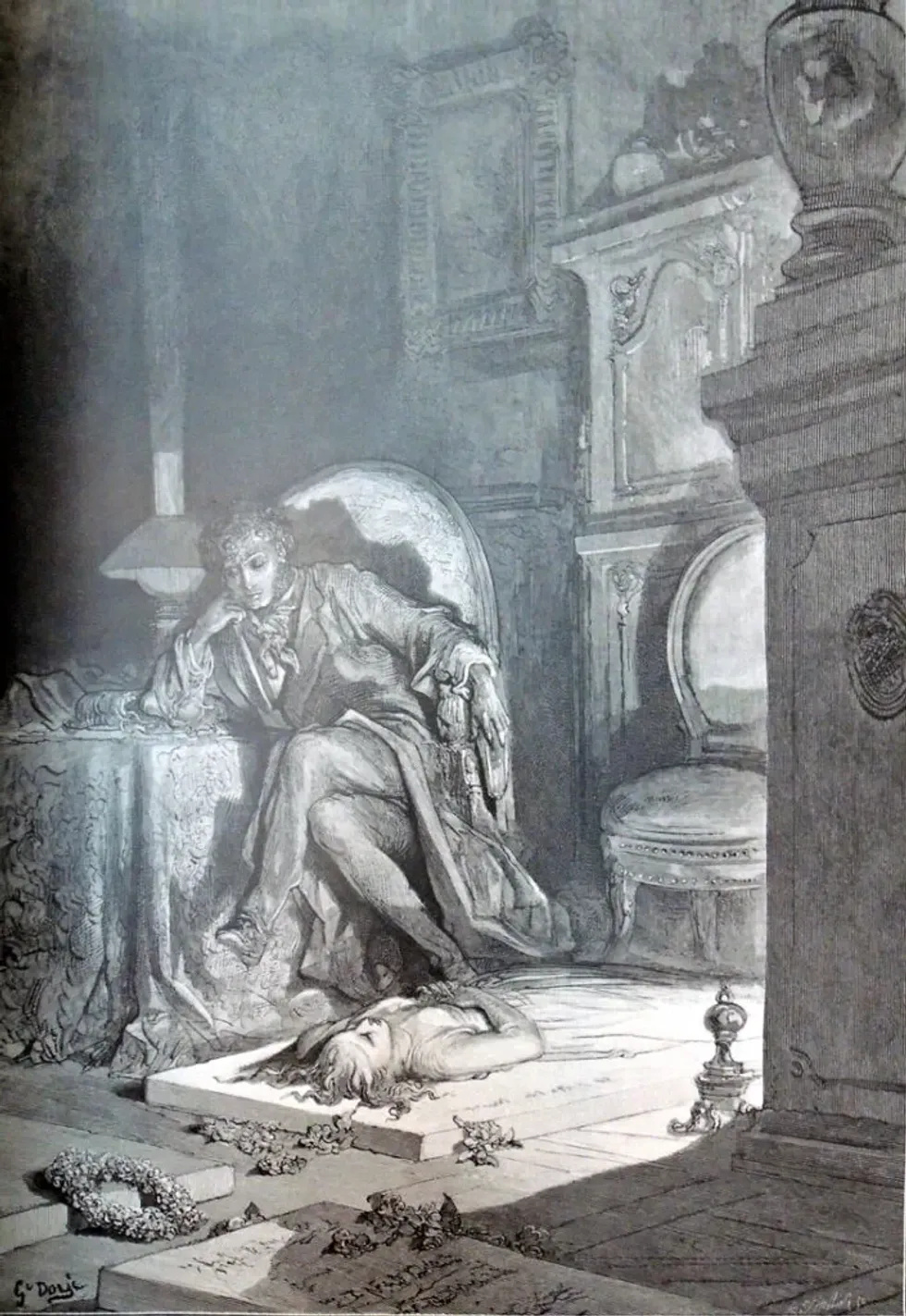 Ilustrimet për Edgar Allan Poen janë ndoshta më pak të njohura, por jashtëzakonisht domethënëse për të kuptuar afërsinë shpirtërore mes dy artistëve. Doré gjen te Poe një botë të ankthit të brendshëm, të mendjes së fragmentuar dhe të errësirës psikologjike. Figurat janë të izoluara, arkitekturat shtypëse, dhe drita duket sikur buron nga një burim i paidentifikueshëm, pothuaj halucinant. Këtu, Doré afrohet me simbolizmin e vonë, duke paraprirë zhvillime që arti evropian do t’i përqafonte vetëm dekada më pas.