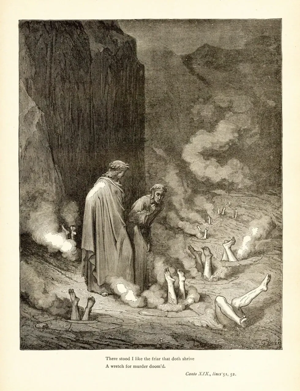 Ilustrimet për Komedinë hyjnore të Dantes mbeten ndoshta arritja më monumentale e tij. Aty ai nuk synon të konkurrojë tekstin, por ta përkthejë atë në një gjuhë pamore të barasvlershme. Ferri i Dorés është një teatër kozmik dhimbjeje, ku trupat njerëzorë shkrihen në masa anonime vuajtjeje, ndërsa figurat e Dantes dhe Virgjilit shfaqen si dëshmitarë të heshtur. Kompozimet janë të ndërtuara mbi diagonale të forta dhe kontraste ekstreme, duke krijuar ndjesinë e lëvizjes së pandalshme drejt dënimit. Ndryshe nga shumë interpretime moralizuese, Doré e lexon Danten si poet të madh të frikës ekzistenciale, jo vetëm të teologjisë.