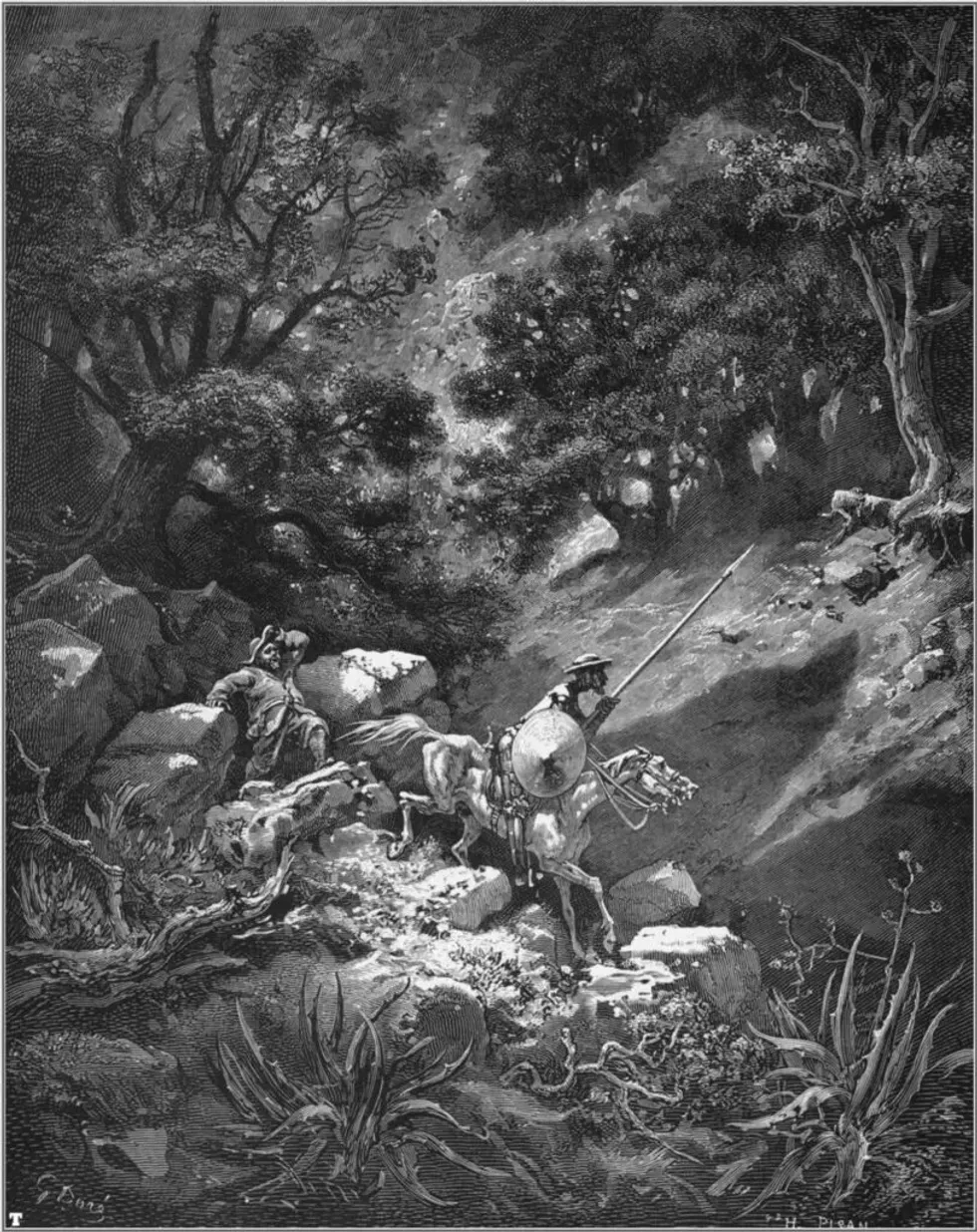 Në ilustrimet për Servantesin dhe Don Kishotin, ai shfaq një anë tjetër të gjenialitetit të tij: ironinë tragjike. Don Kishoti i tij nuk është karikaturë, por figurë fisnike në marrëzinë e vet. Trupi i gjatë, i hollë, i shtrembëruar nga era dhe iluzioni, qëndron gjithmonë në kontrast me peizazhin e pafund dhe indiferent. Doré e kupton thelbin e romanit si përplasje mes idealit dhe realitetit, dhe e përkthen këtë përplasje përmes shkallëzimit të figurës njerëzore në raport me hapësirën. Këtu, grotesku dhe sublimja bashkëjetojnë në mënyrë të pazgjidhshme.