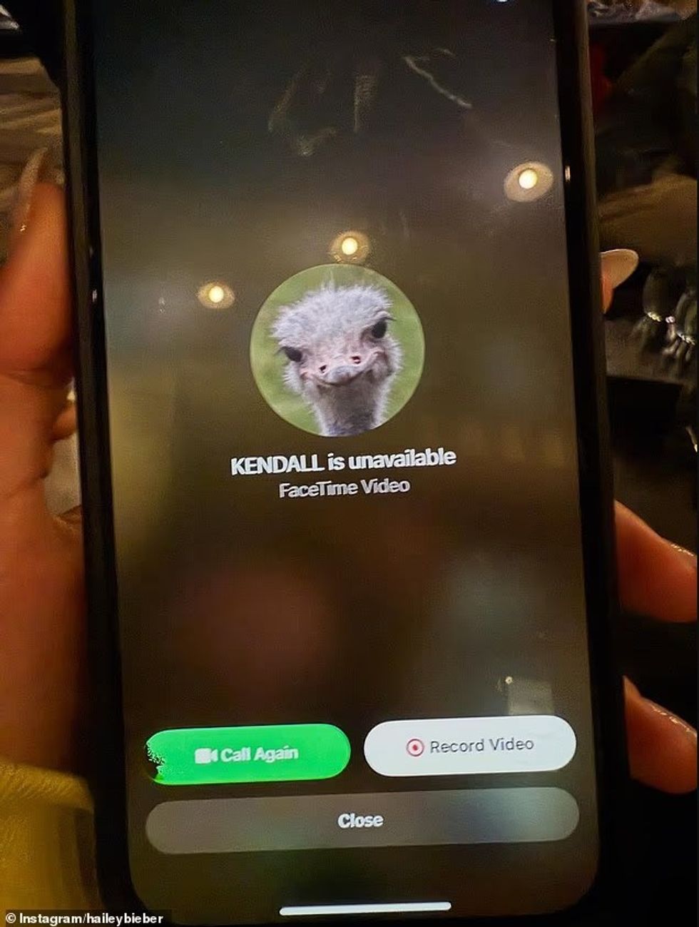 Në karuselin e fotografisë, Hailey tregoi ekranin e telefonit ku shkruhej “KENDALL nuk është e disponueshme”, me një figurë struci që shfaqej si imazhi i profilit të Kendall.