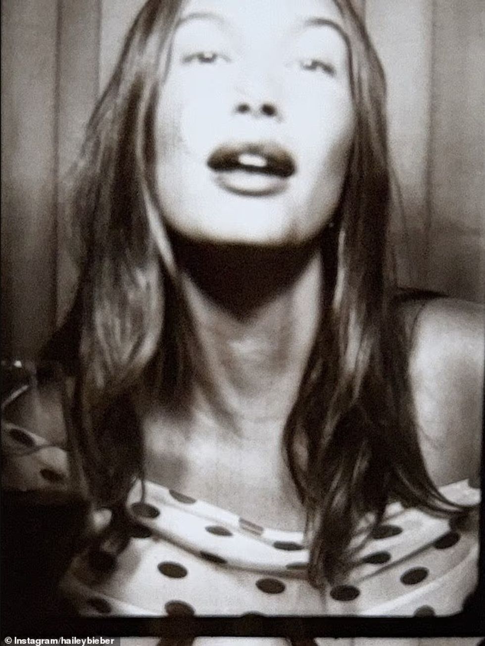 E ulur në një stol rustik gjatë festës, Hailey kishte veshur një fustan të shkurtë me pika dhe mëngë të tejdukshme, duke mbajtur në dorë një gotë verë të kuqe.