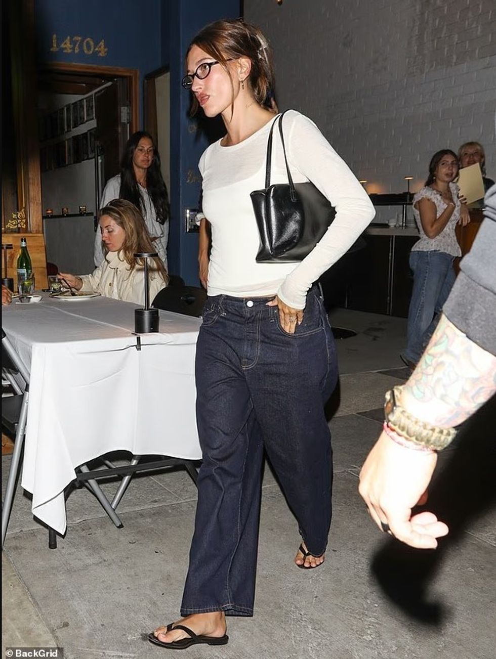 28-vjeçarja u pa duke dalë nga restoranti i njohur Anajak Thai në Sherman Oaks, e veshur me një bluzë të bardhë transparente, xhinse të gjera në stilin "boyfriend", dhe shapka të zeza, një kombinim që theu pritshmëritë për një figurë të modës si ajo.