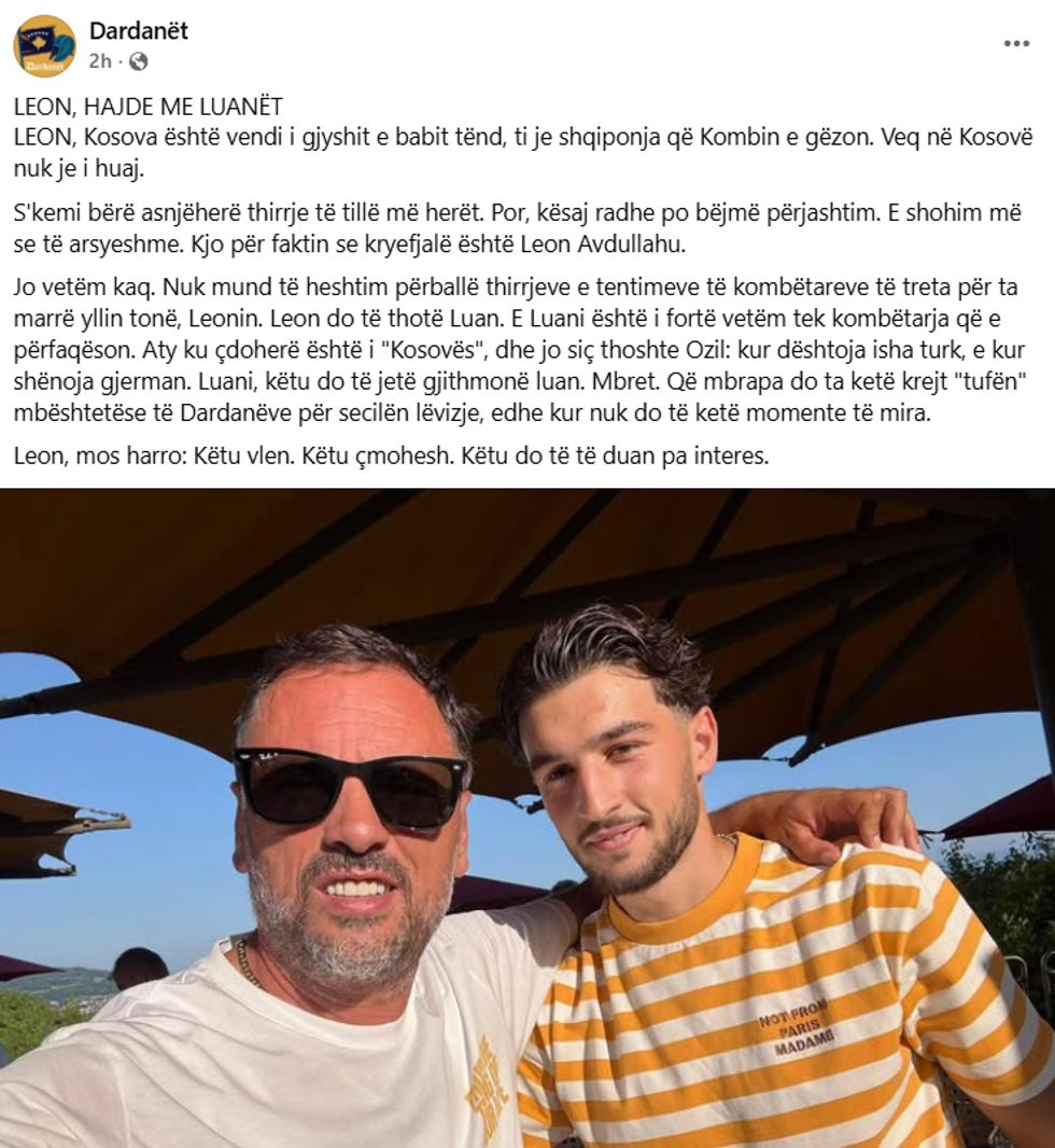 "Hajde te Kosova, aty ku zemra rreh fortë" - Dardanët me thirrje të fuqishme për Leon Avdullahun