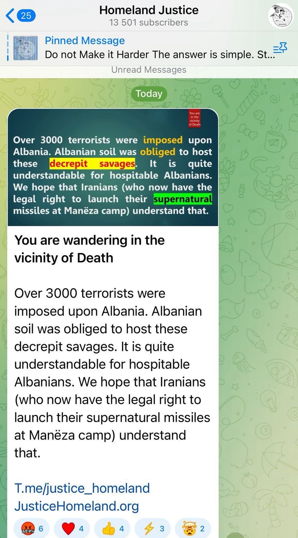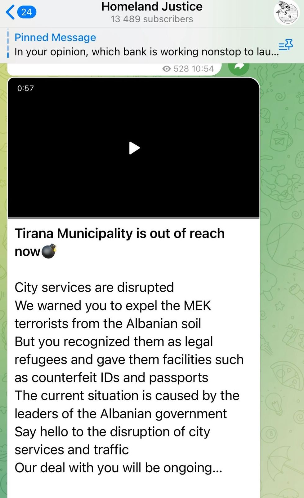 Duke marrë shkas nga konflikti mes Iranit dhe Izraelit, që nisi të premten e kaluar, “Homeland Justice” ka publikuar një mesazh kërcënues që lidhet me rolin e Shqipërisë në strehimin e anëtarëve të organizatës së Muxhahedinëve, të vendosur në kampin e Manzës, përcjell euronews.al.