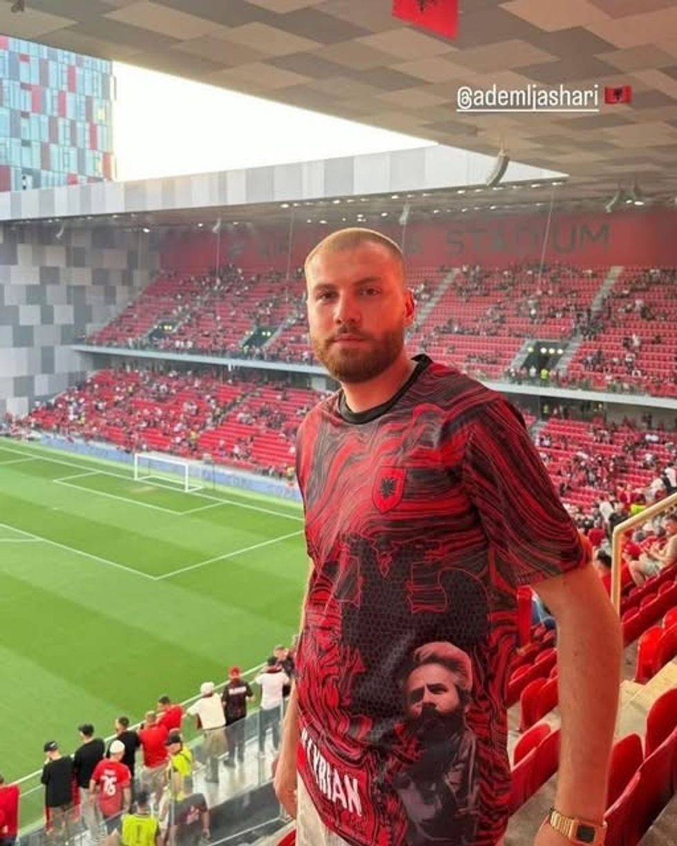 Ademi, i veshur me fanellën ku shfaqet portreti i heroit kombëtar Adem Jashari, është përshëndetur ngrohtësisht nga tifozët shqiptarë.