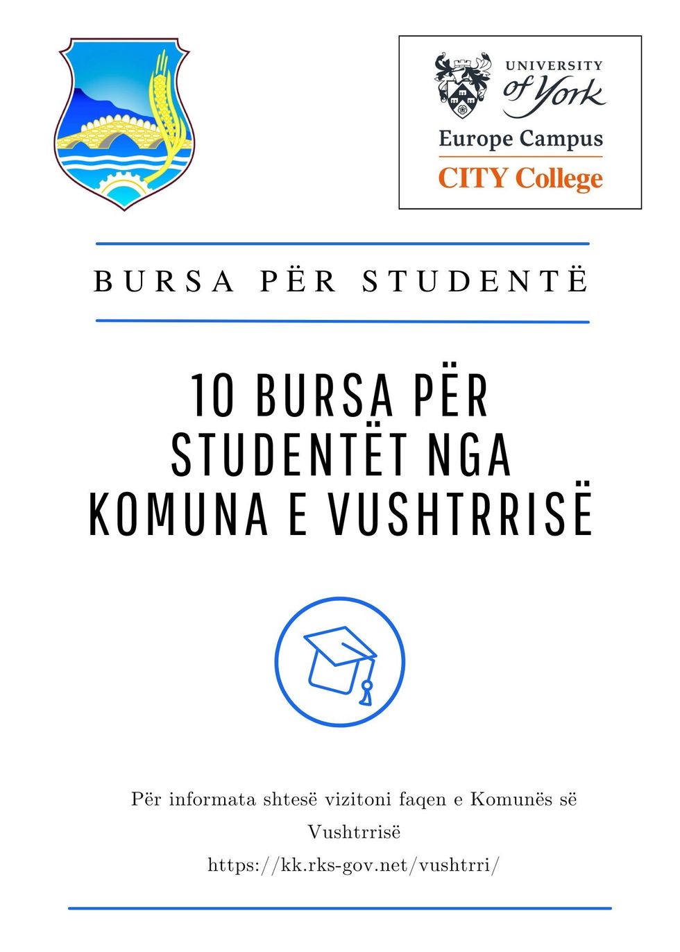 “Është hapur aplikimi për 10 bursa studimi për studentët vushtrrias, të cilat ndahen nga Komuna e Vushtrrisë në bashkëpunim me CITY College, Kampusi i Universitetit të York Europe në Selanik, Greqi”, ka thënë Idrizi.