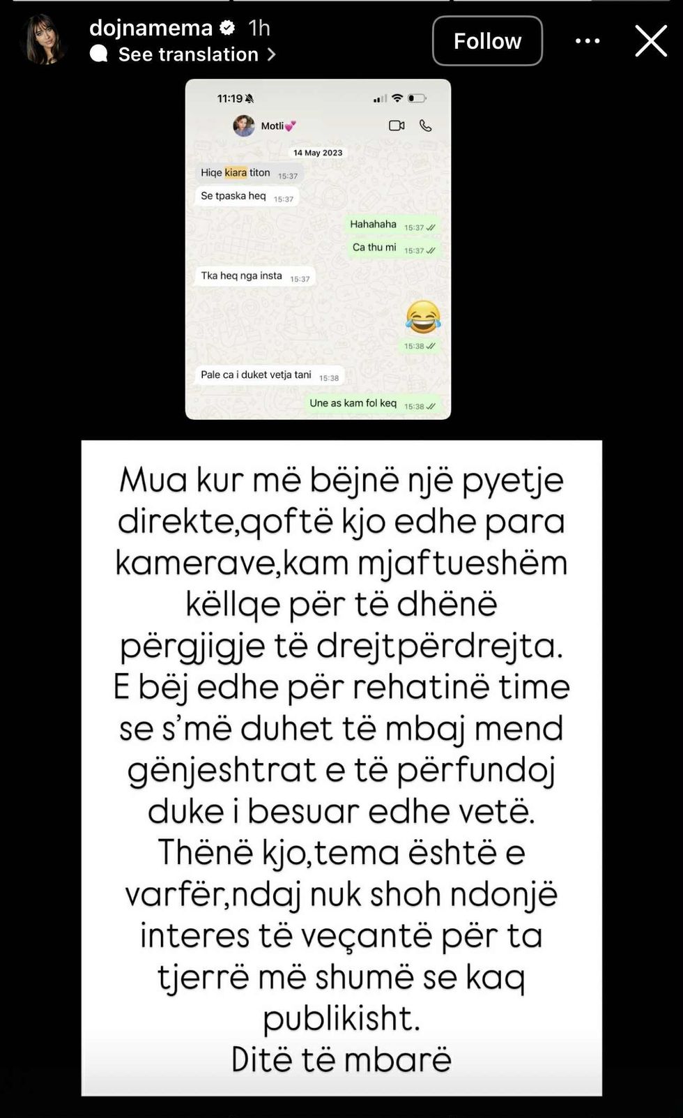 Gjithçka nisi një javë më parë, kur në emisionin “Mirëmbrëma Yje”, Dojna tregoi se Kiara e kishte hequr nga Instagrami, por pa e ditur arsyen pse.