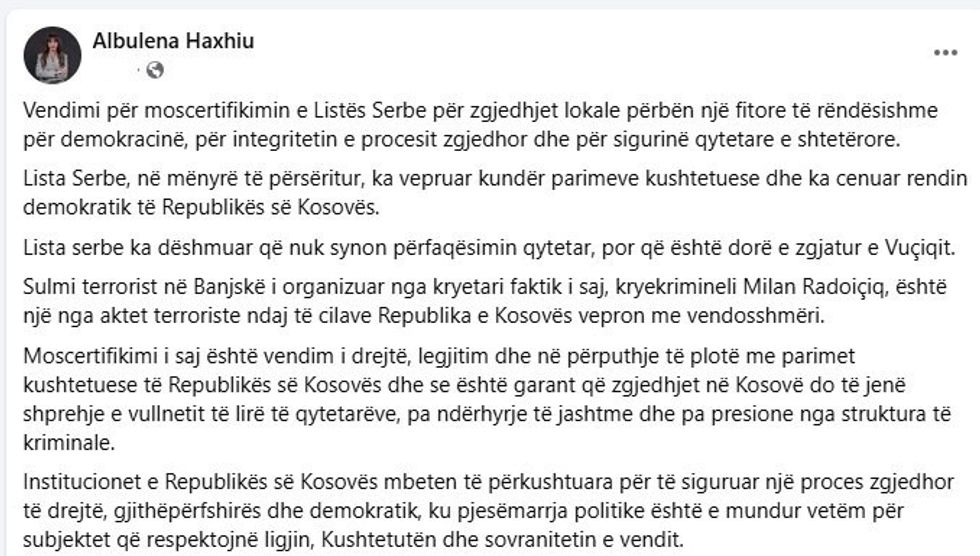 “Vendimi për moscertifikimin e Listës Serbe përbën një fitore të rëndësishme për demokracinë, integritetin e procesit zgjedhor dhe sigurinë qytetare e shtetërore. Lista Serbe, në mënyrë të përsëritur, ka vepruar kundër parimeve kushtetuese dhe ka cenuar rendin demokratik të Republikës së Kosovës. Ajo nuk ka synuar përfaqësim qytetar, por ka shërbyer si dorë e zgjatur e Vuçiqit. Sulmi terrorist në Banjskë, i organizuar nga kryetari i saj faktik, Milan Radoiçiq, është një nga aktet kriminale ndaj të cilave Kosova ka reaguar me vendosmëri”, ka deklaruar Haxhiu.