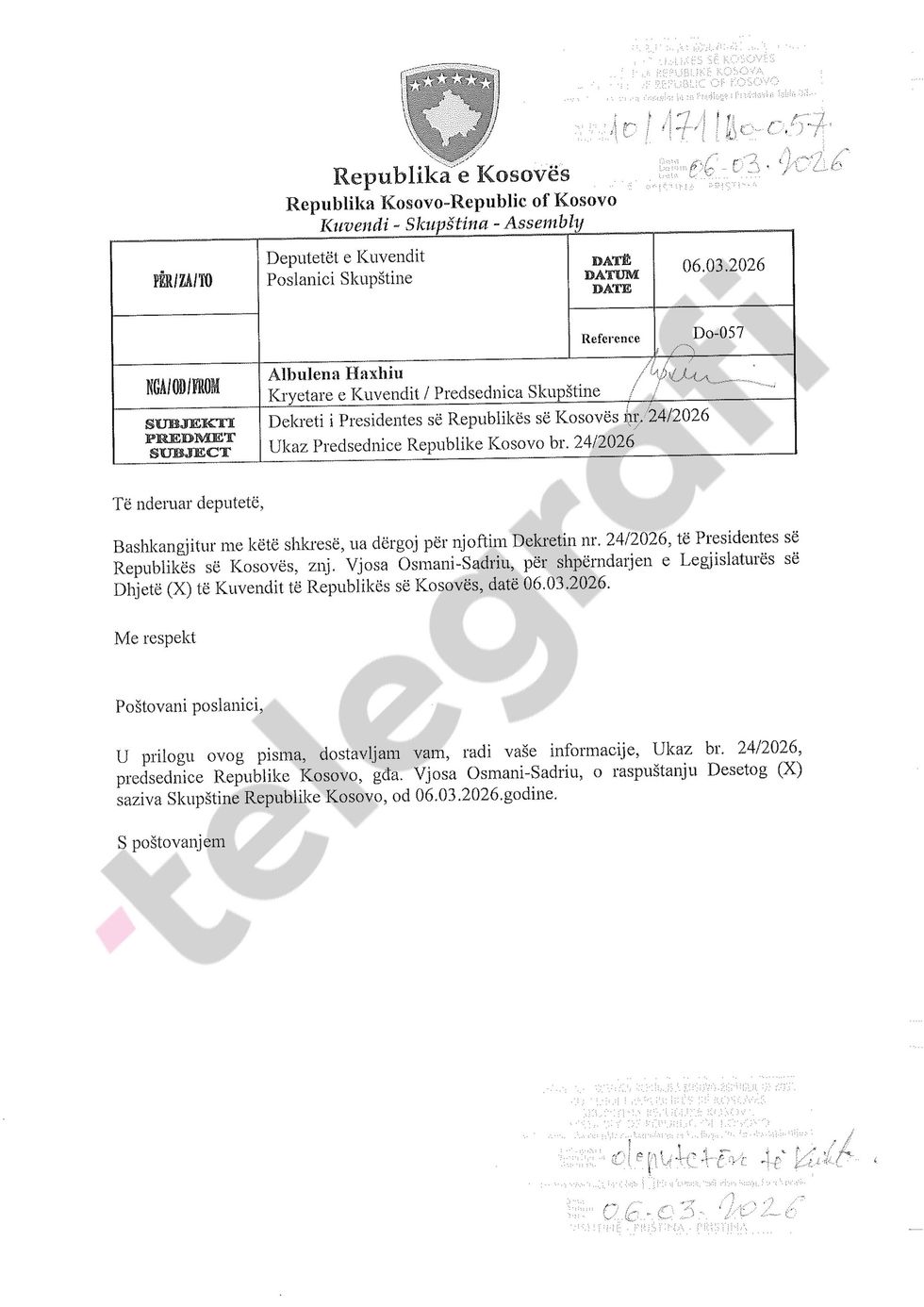 Në një shkresë zyrtare për deputetët e Kuvendit, kryetarja Haxhiu u ka bashkëngjit dekretin e presidents.