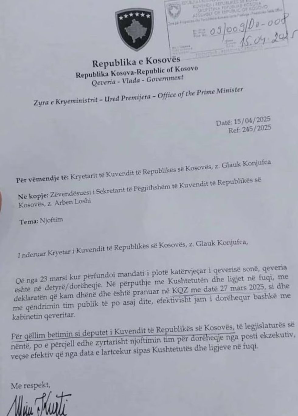 IKD: Letra e dorëzuar nga Kurti, nuk paraqet akt të dorëheqjes