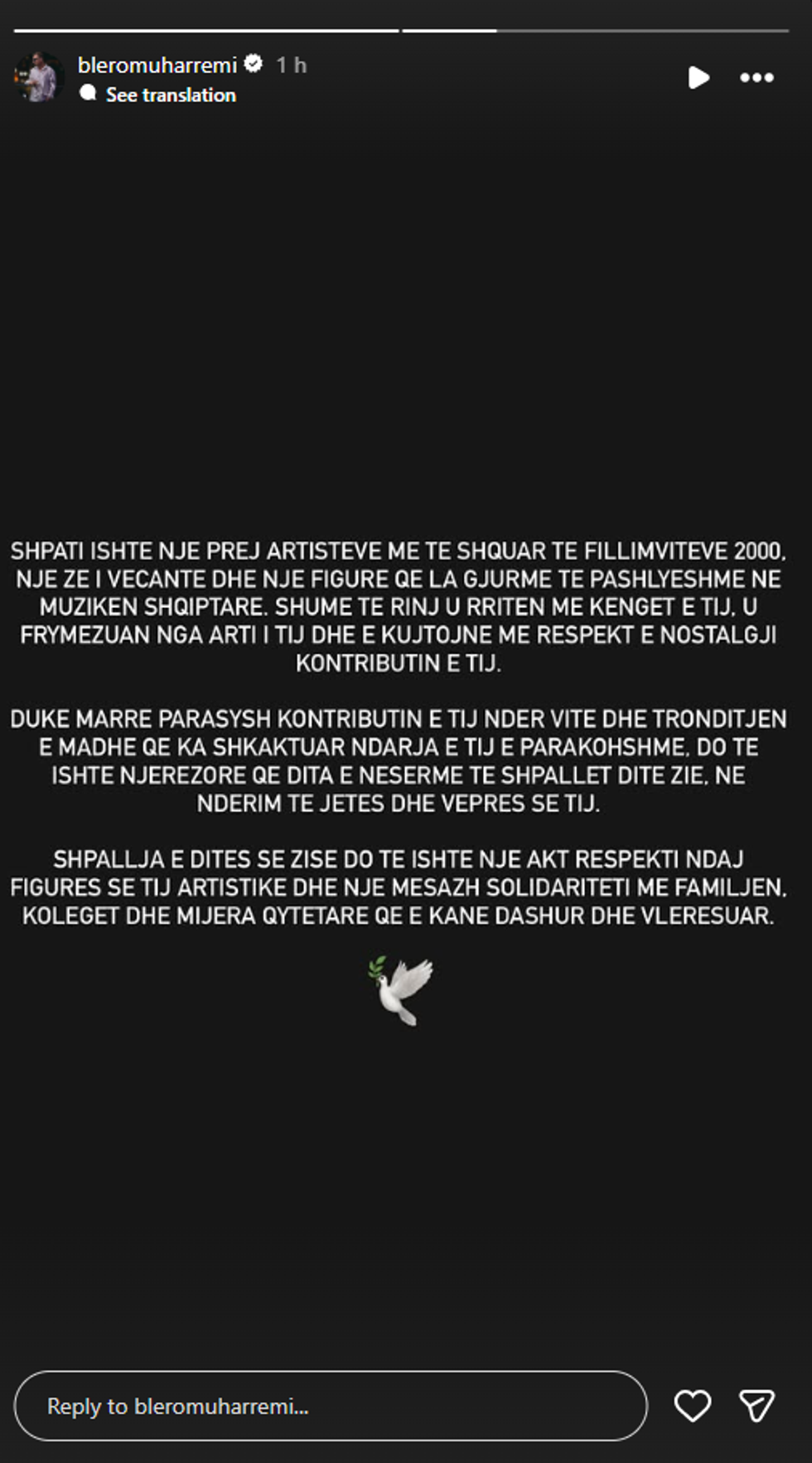"Shpati ishte një prej artistëve më të shquar të fillim viteve 2000. Një zë i veçantë dhe një figurë që la gjurmë të pashlyeshme në muzikën shqiptare. Shumë të rinj u rritën me këngët e tij. Duke marrë parasysh kontributin e tij ndër vite dhe tronditjen e madhe që ka shkaktuar ndarja e tij e parakohshme, do të ishte njerëzore që dita e nesërme të shpallet ditë zie. Në nderim të jetës dhe veprës së tij. Shpallja e ditës së zisë do të ishte një akt respekti ndaj figurës së tij artistike dhe një mesazh solidariteti me familjen", ka shkruar mes tjerash Blero në postimin e tij.