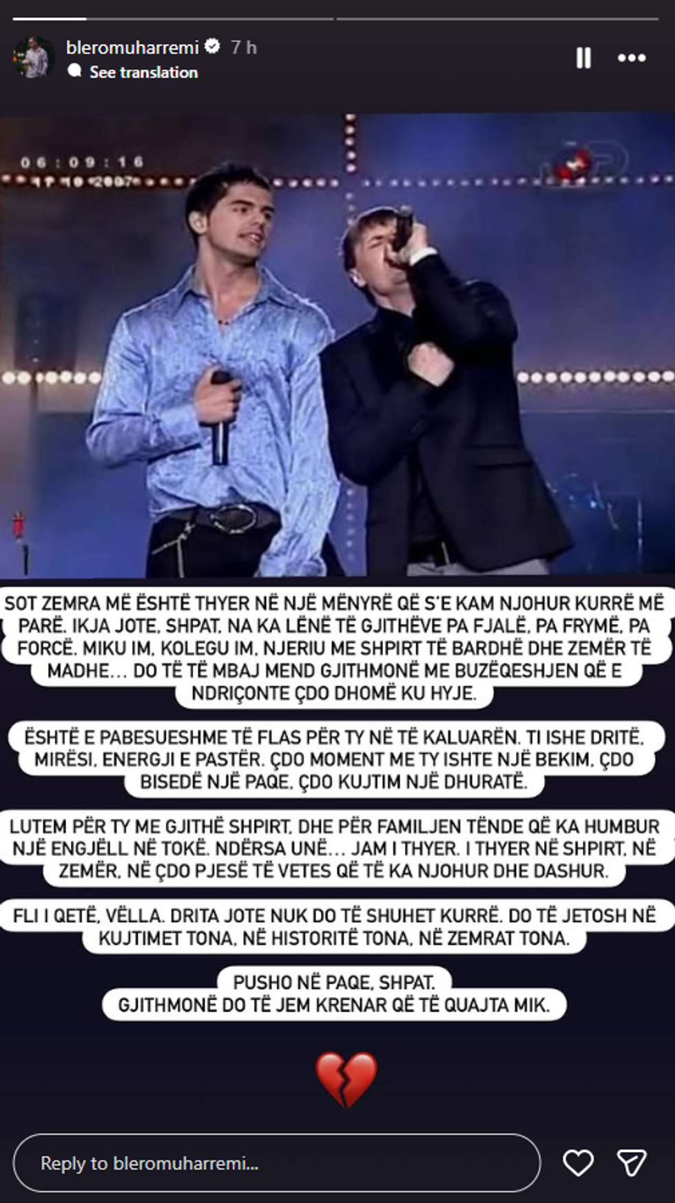 Gjatë ditës së sotme, ai, përmes një postimi në Instagram, deklaroi se ishte thellësisht i prekur nga kjo tragjedi.