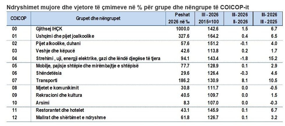 Ndërkohë, disa kategori kanë shënuar ulje të çmimeve gjatë kësaj periudhe, përfshirë energjinë elektrike (-3,7%) dhe lëndët djegëse të ngurta (-2,2%), të cilat kanë zbutur pjesërisht rritjen e përgjithshme të çmimeve.