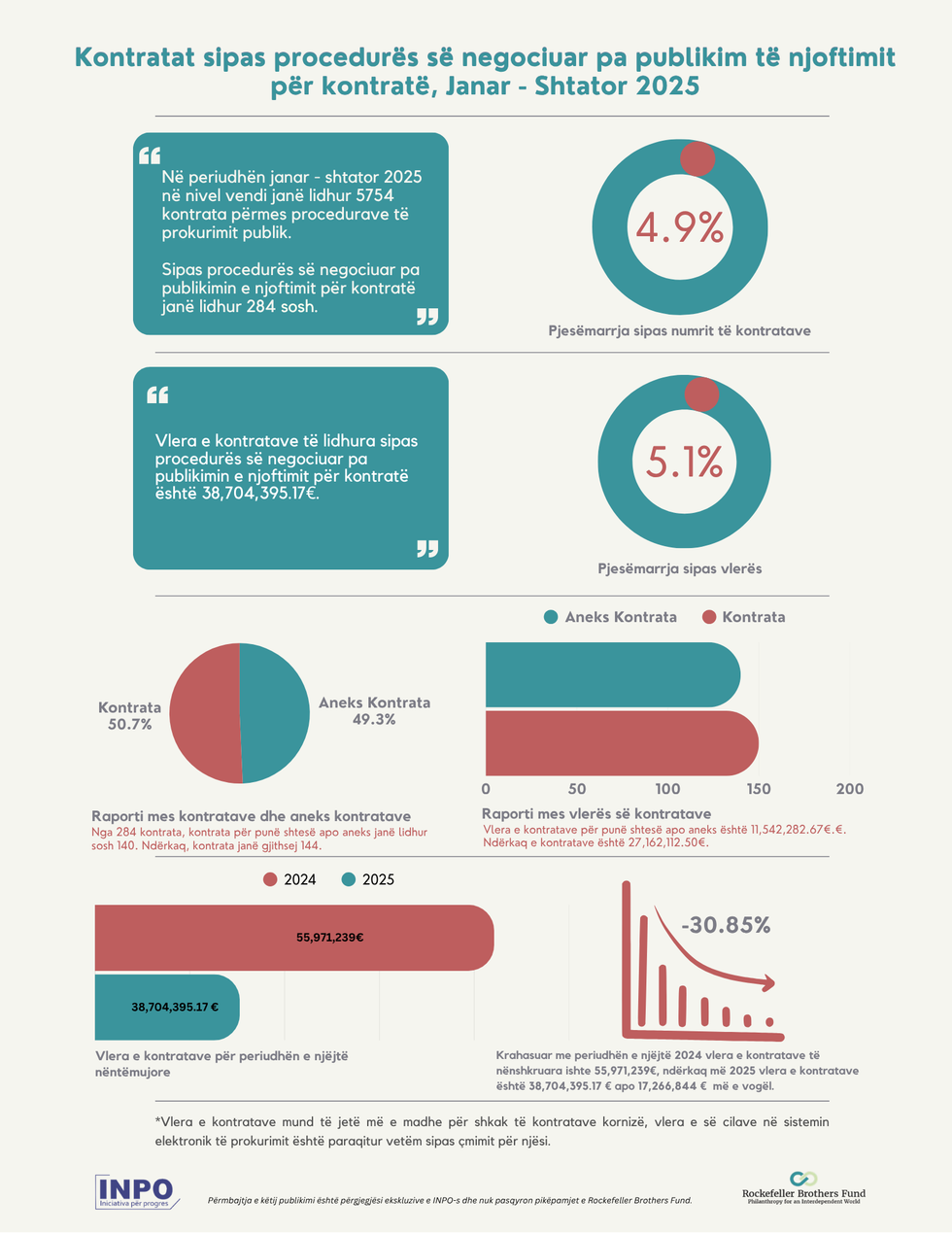 Iniciativa për Progres (INPO) ka publikuar infografikën e kontratave të lidhura përmes procedurës së negociuar pa publikim të njoftimit për kontratë për periudhën janar – shtator 2025, duke evidentuar një ulje prej 30.85% të vlerës së këtyre kontratave krahasuar me periudhën e njëjtë të vitit paraprak.