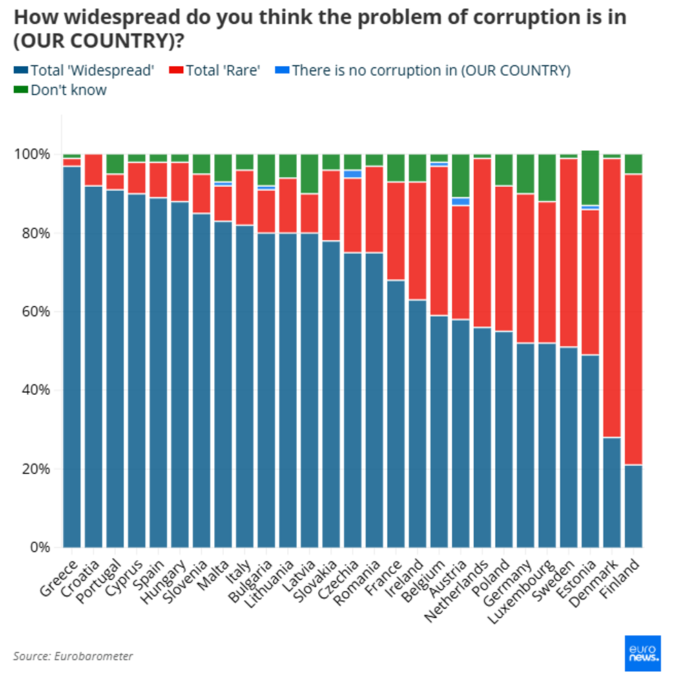 Në disa vende, ky problem perceptohet si më i theksuar se në të tjera. Greqia shënon nivelin më të lartë me 97 për qind të të anketuarve që e konsiderojnë korrupsionin të përhapur në shoqërinë e tyre, e ndjekur nga Kroacia me 92 për qind dhe Portugalia me 91 për qind.