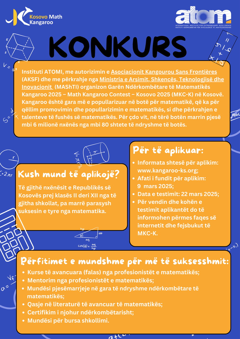 Instituti ATOMI, me autorizimin e Asociacionit Kangourou Sans Frontières (AKSF) dhe me përkrahje nga Ministria e Arsimit, Shkencës, Teknologjisë dhe Inovacionit (MAShTI) organizon Garën Ndërkombëtare të Matematikës Kangaroo 2025 – Math Kangaroo Contest – Kosovo 2025 (MKC-K) në Kosovë.
