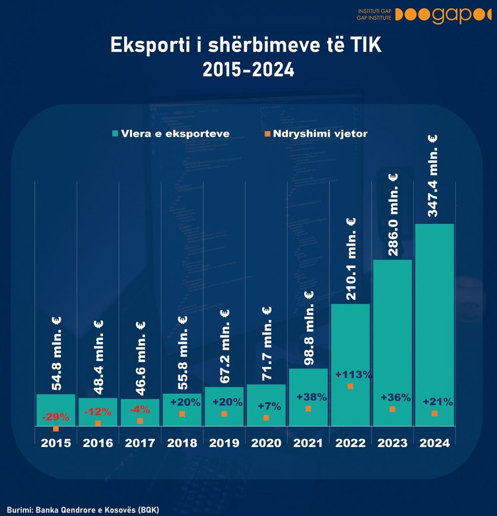Në vitin 2024, eksportet e shërbimeve të Teknologjisë së Informacionit dhe Komunikimit (TIK) nga Kosova arritën në 347.4 milionë euro, me një rritje prej 21% (+61.4 milionë euro📈) krahasuar me vitin 2023.