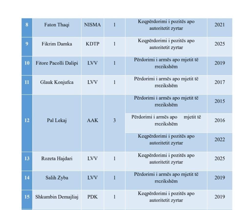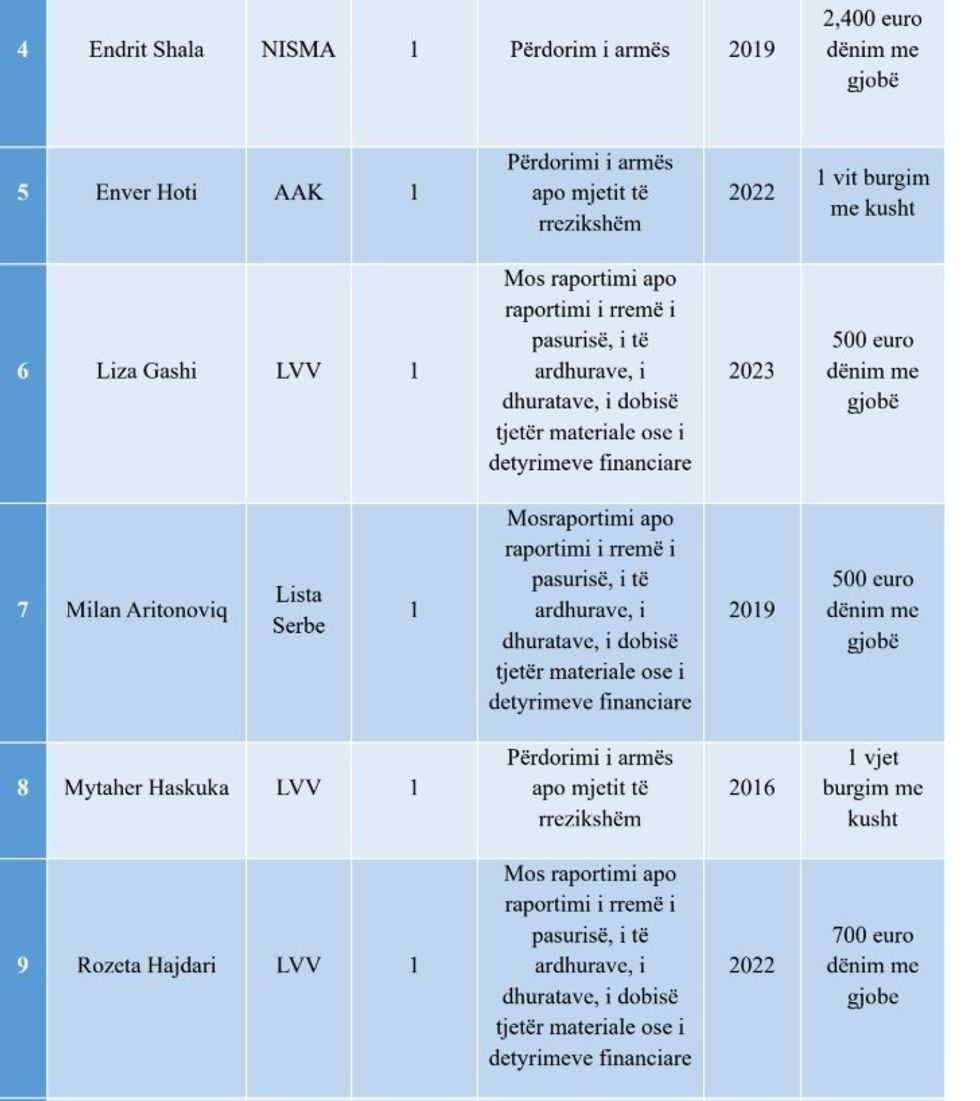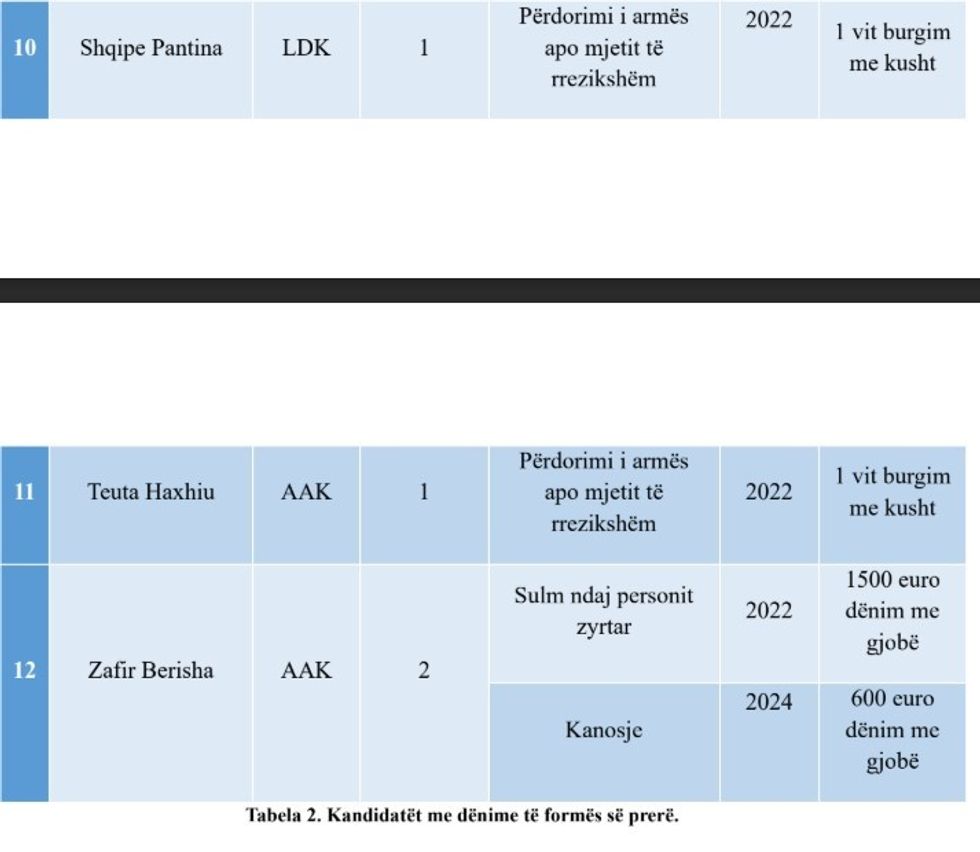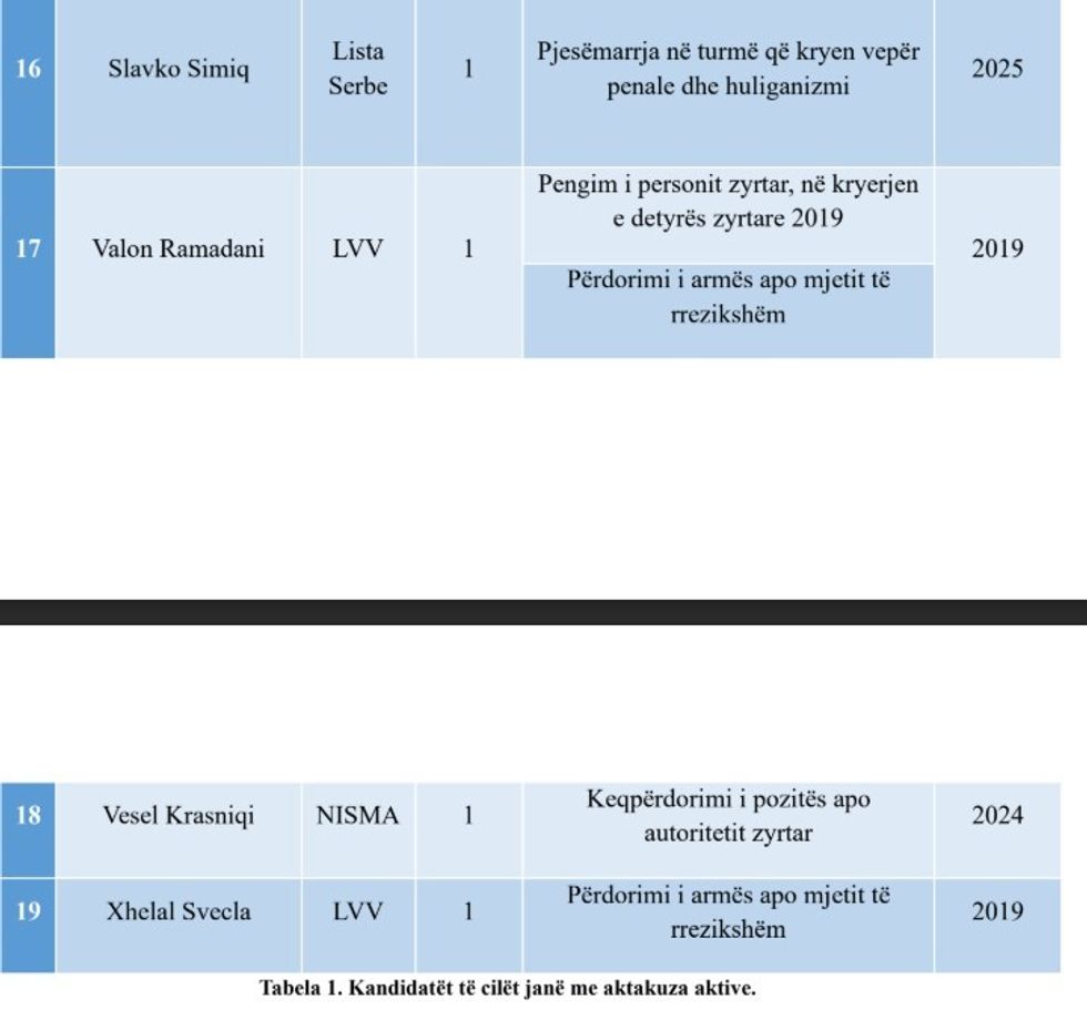 “Sa i përket veprave penale në të cilat janë të përfshirë kandidatët, dominojnë veprat penale nga kapitulli i korrupsionit zyrtar dhe veprat penale kundër detyrës zyrtare dhe vepra penale ‘Përdorimi i armës apo mjetit të rrezikshëm’.