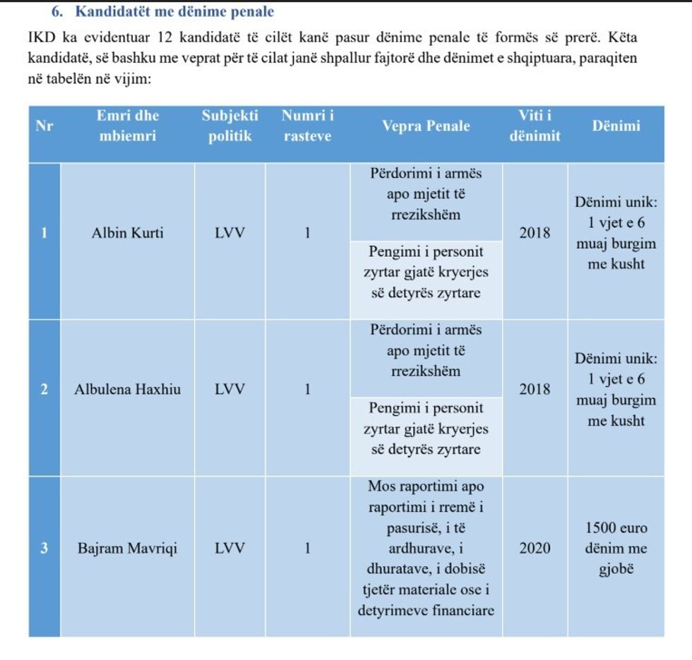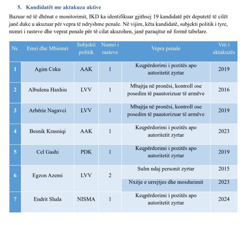 “Duke mos cenuar parimin e prezumimit të pafajësisë, sikurse edhe në ciklet e tjera zgjedhore, edhe në këtë rast, IKD bazuar në të dhënat e saj nga monitorimi i proceseve gjyqësore, në këtë raport ka paraqitur kandidatët për deputetë që janë përfshirë në raste penale. Kandidatë të tillë cilësohen të gjithë kandidatët e identifikuar të cilët kanë aktakuza aktive apo dënime penale të formës së prerë.