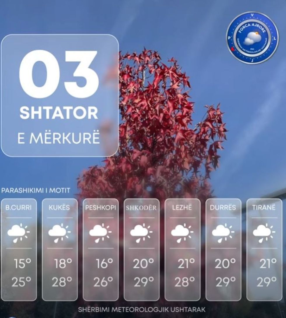 Pas orëve të pasdites mot kryesisht me kthjellime e vranësira mesatare deri të dendura në relievet malore në lindje të cilat do të shoqërohen me reshje shiu afatshkurtra dhe të dobëta.
