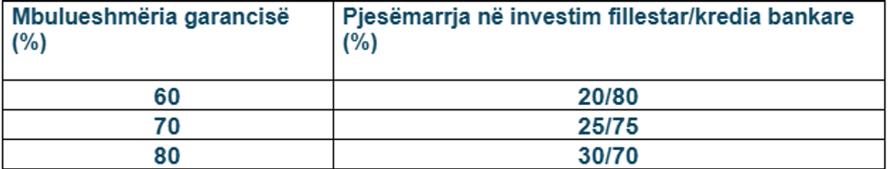 - Përqindja e mbulueshmërise me garanci sipas pjesëmarrjes në investim fillestar/kredi bankare.