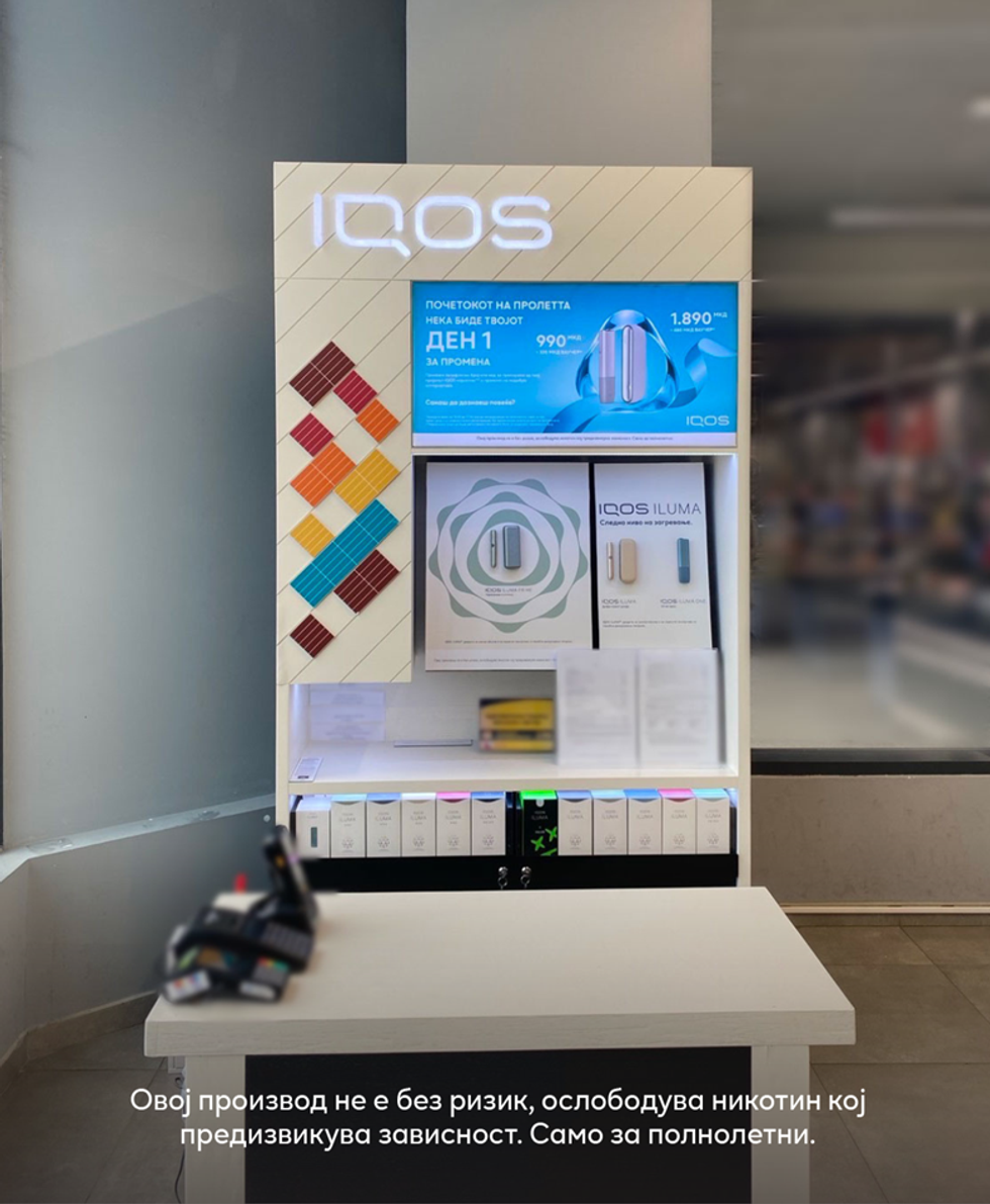 Kemi lajme të mira për të gjithë përdoruesit e IQOS, IQOS ndjek këtë dinamikë dhe përmes Njësive të Shitjes POP-UP IQOS sjell mënyrë më të shpejtë dhe më të thjeshtë për të hyrë në produktet dhe shërbimet e IQOS. Këto pika të shitjes me pakicë të shfaqur ofrojnë mundësinë për t'u njohur me pajisjet IQOS, për të marrë mbështetje nga ekspertët ose për të gjetur të gjithë aksesorët që ju nevojiten – të gjitha në një vend. Përveç kësaj, stafi në këto lokacione ofron shërbime edhe në gjuhën maqedonase dhe shqipe, duke ofruar përvojë më të mirë dhe më të këndshme për çdo përdorues.