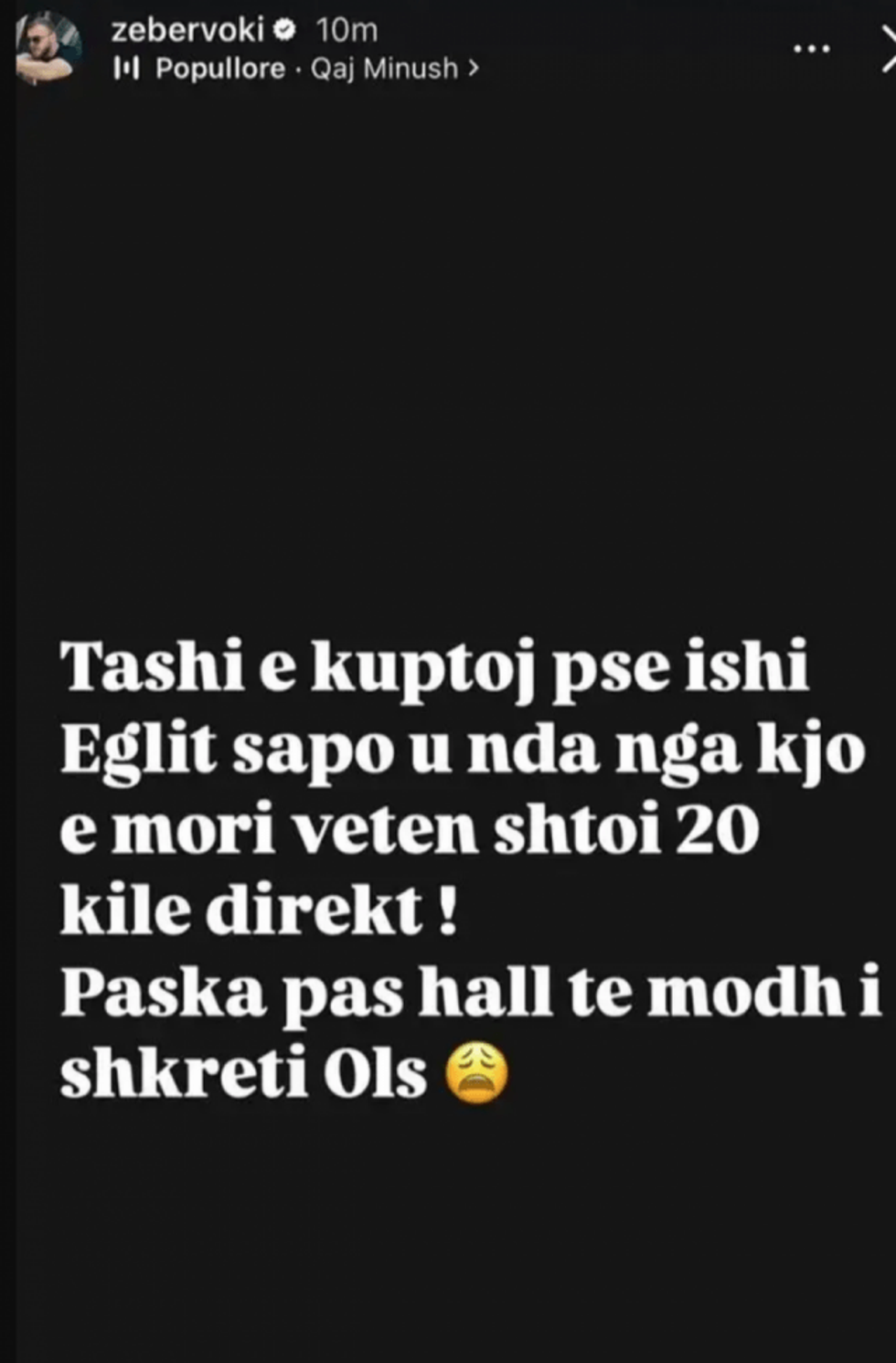 Në një tjetër postim, Zebërvoki hodhi një koment ironik mbi të kaluarën e Eglit, duke iu referuar ish-lidhjes së saj me aktorin dhe këngëtarin Ols Bylyku.