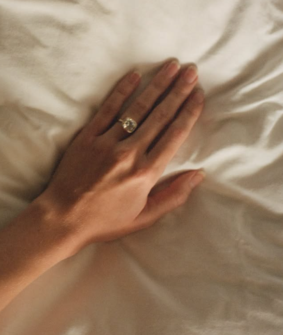 Në foton e parë, çifti pozon i përqafuar, me një unazë të madhe diamanti të dukshme në dorën e saj.
