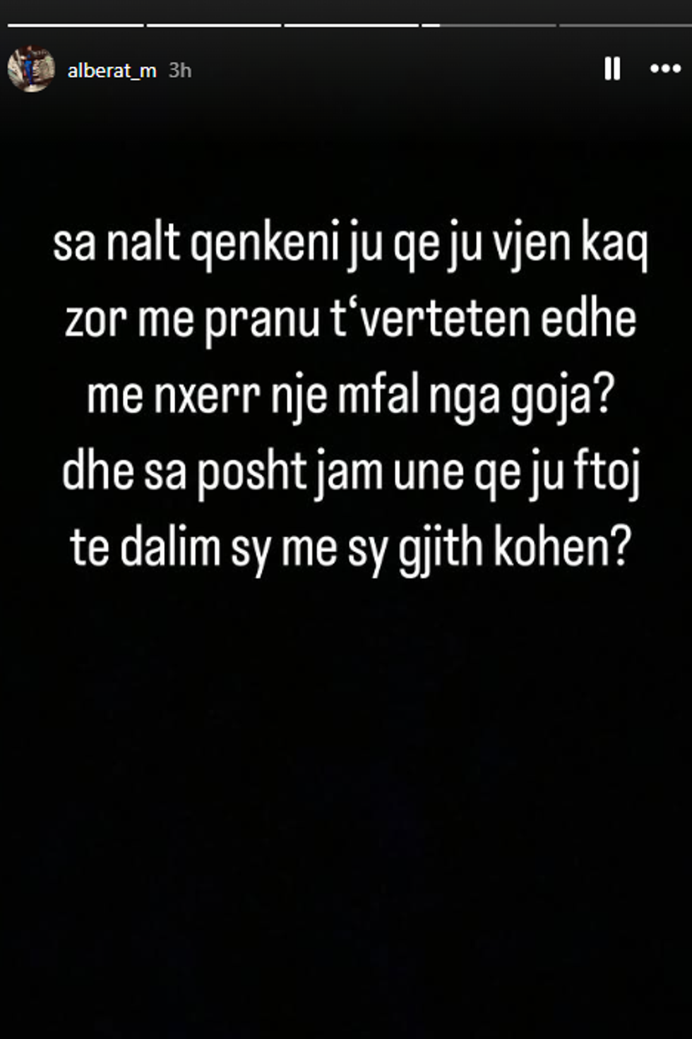 “Sa lart qenkeni ju që ju vjen kaq zor me pranu të vërtetën edhe me nxjerr një më fal nga goja? Dhe sa poshtë jam unë që ju ftoj të dalim sy me sy gjithë kohën.