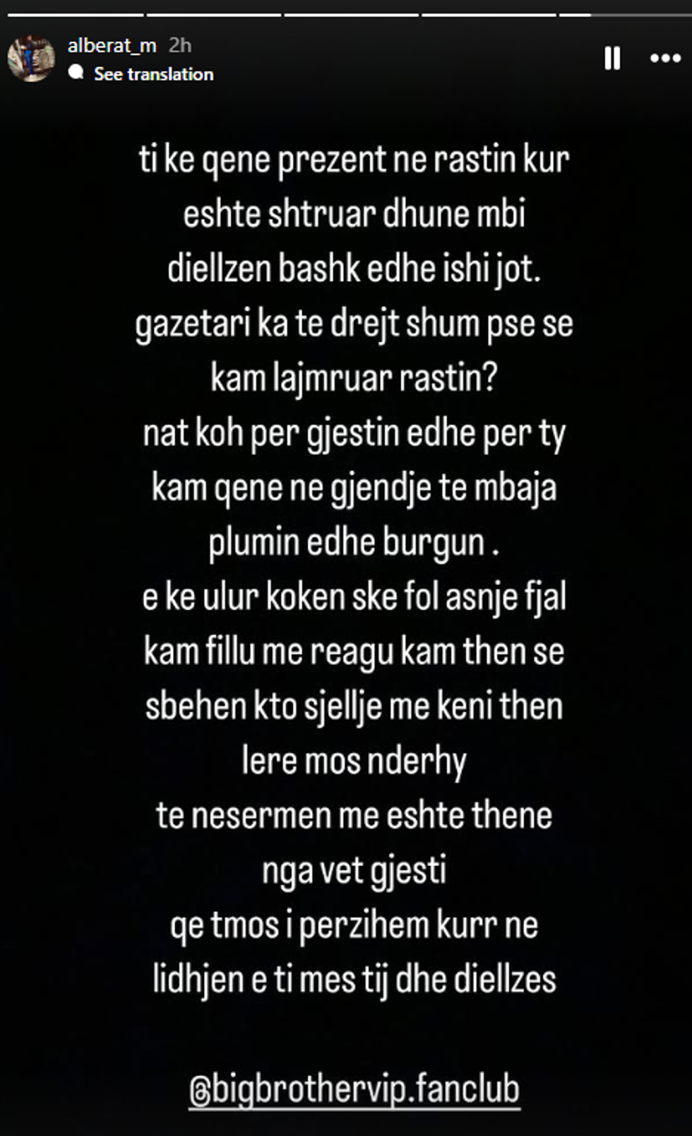 E ke ulur kokën s’ke fol asnjë fjalë kam filluar të reagoj kam thënë se s’bëhen këto sjellje më keni thënë lëre mos ndërhy, të nesërmen më është thënë nga vetë Gjesti që të mos përzihem kurrë në lidhjen e tij, mes tij dhe Diellzës”. /Telegrafi/