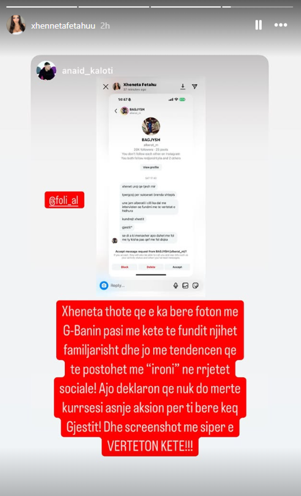I njëjti në mesazhin në InstaStory i ka treguar që është ish-miku i këngëtarit, derisa i kërkoi që të flasin diçka.