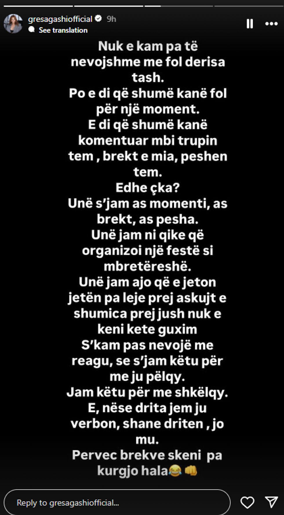 Në një postim në Instagram, Gresa ka zgjedhur të mos heshtë më ndaj kritikave, duke dhënë një përgjigje të drejtpërdrejtë dhe të fuqishme.